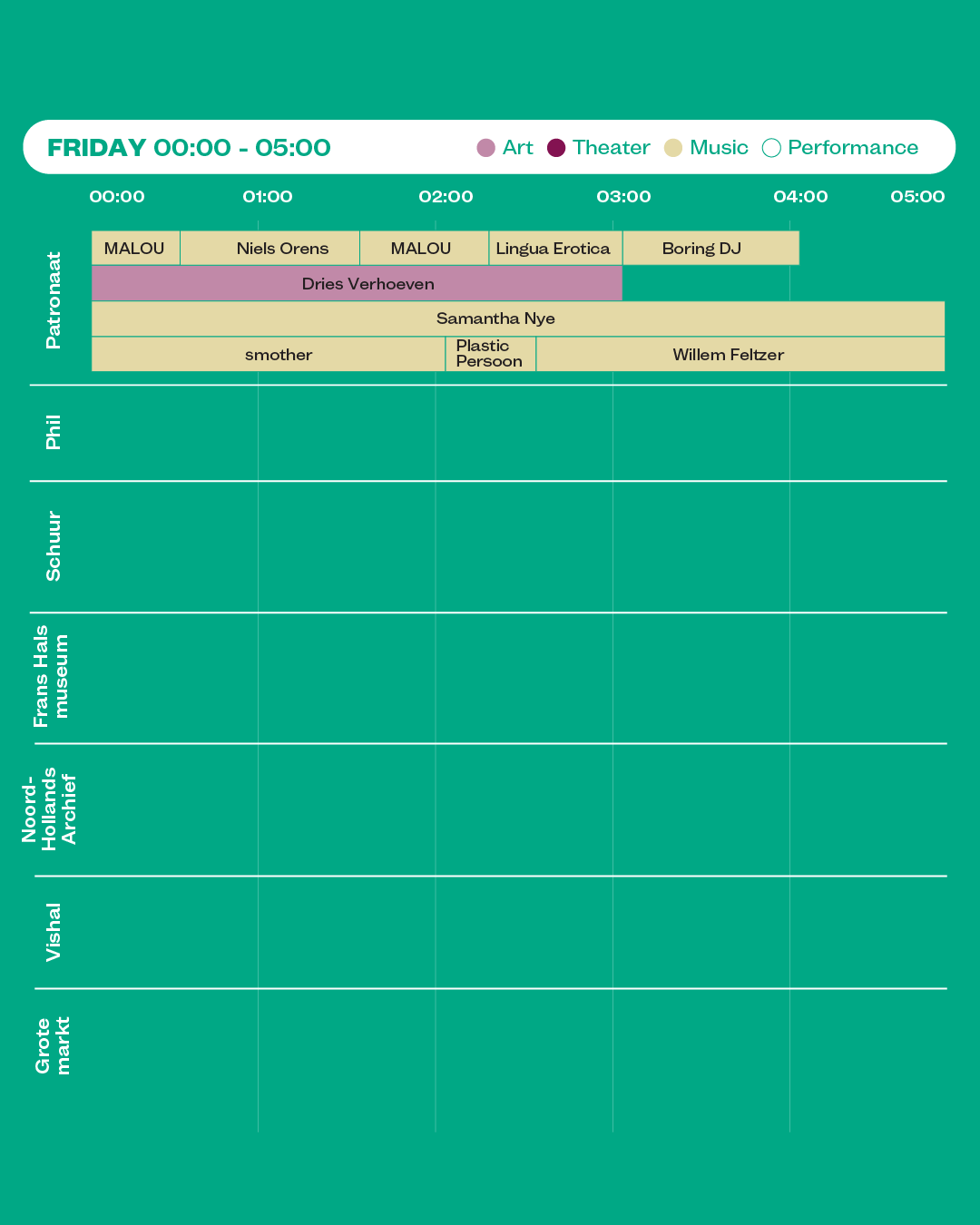 Na middernacht transformeert Boring Festival Patronaat tot het kloppend hart van de nacht: Boring Festival: dé afterparty. Zo is er op vrijdag 6 februari een nachtprogramma dat allesbehalve saai is: met baanbrekende DJ-sets van onder andere MALOU en Niels Orens, iconische live optredens van Lingua Erotica en Plastic Persoon. En dit is nog maar een kleine greep van wat de avond je te bieden heeft…