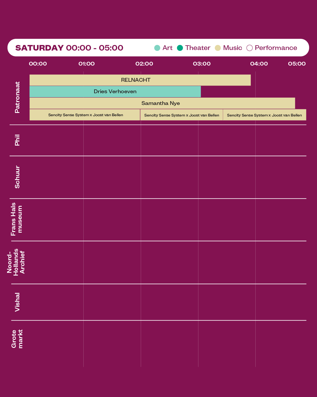 Bij aankomst dien je een polsbandje op te halen bij De Vishal aan de Grote Markt. Je ontvangt het bandje op vertoon van je Boring Festival Ticket. Het polsbandje geeft je toegang tot alle locaties op het festival en het nachtprogramma, met meer dan 20 performances per dag. De ticketbalie is vanaf 18:00 geopend.