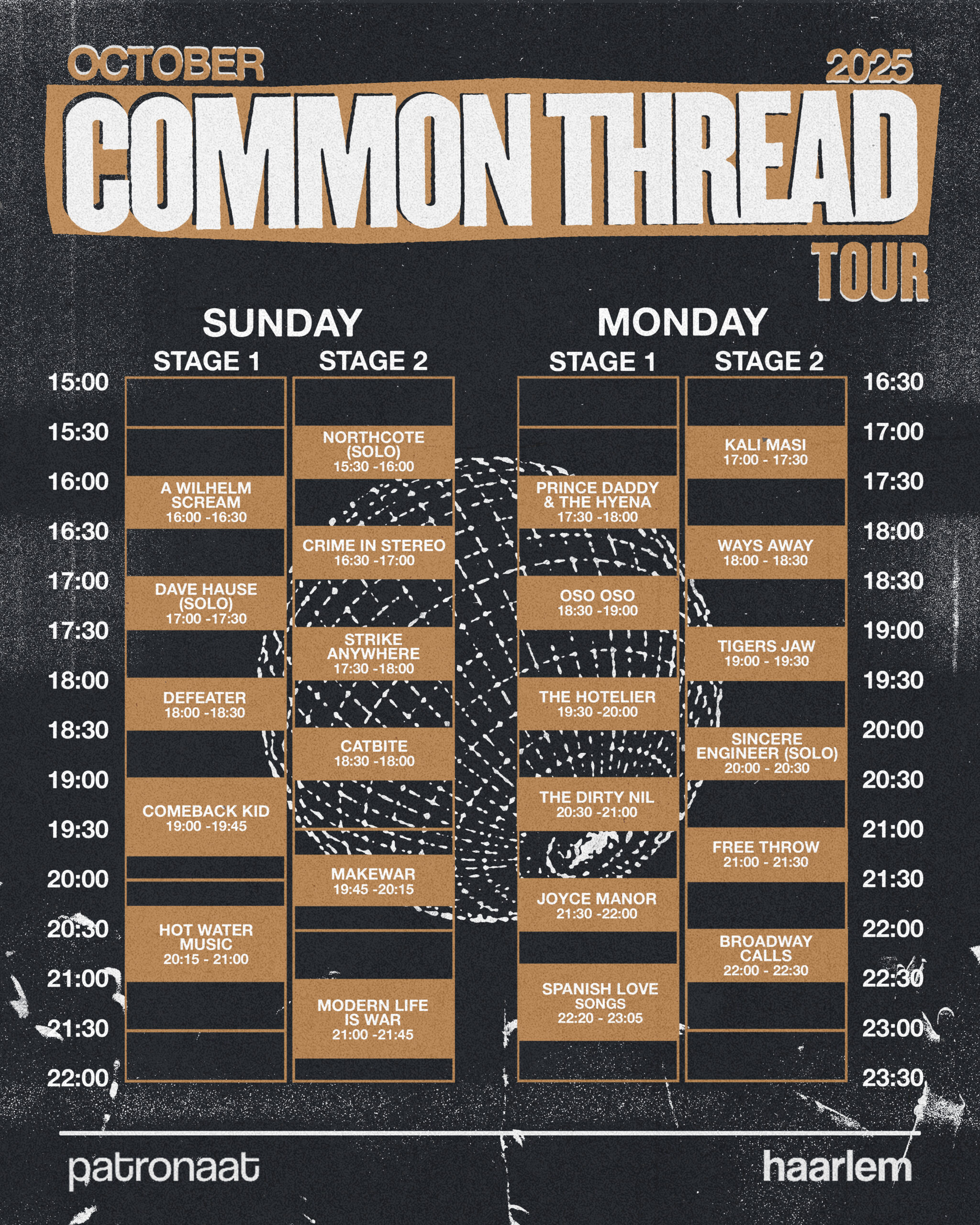 De Common Thread tour is de absolute droom voor punk-, hardcore- en emo-liefhebbers! Op 19 en 20 oktober 2025 staan Comeback Kid, Hot Water Music, Spanish Love Songs, Defeater, Joyce Manor, Modern Life is War en nog 17 andere bands in Stage 1 en 2 in Patronaat. De line-up bevat een mix van bands die al tientallen jaren actief zijn en jongere bands die zich de afgelopen jaren sterk hebben ontwikkeld binnen de scene.