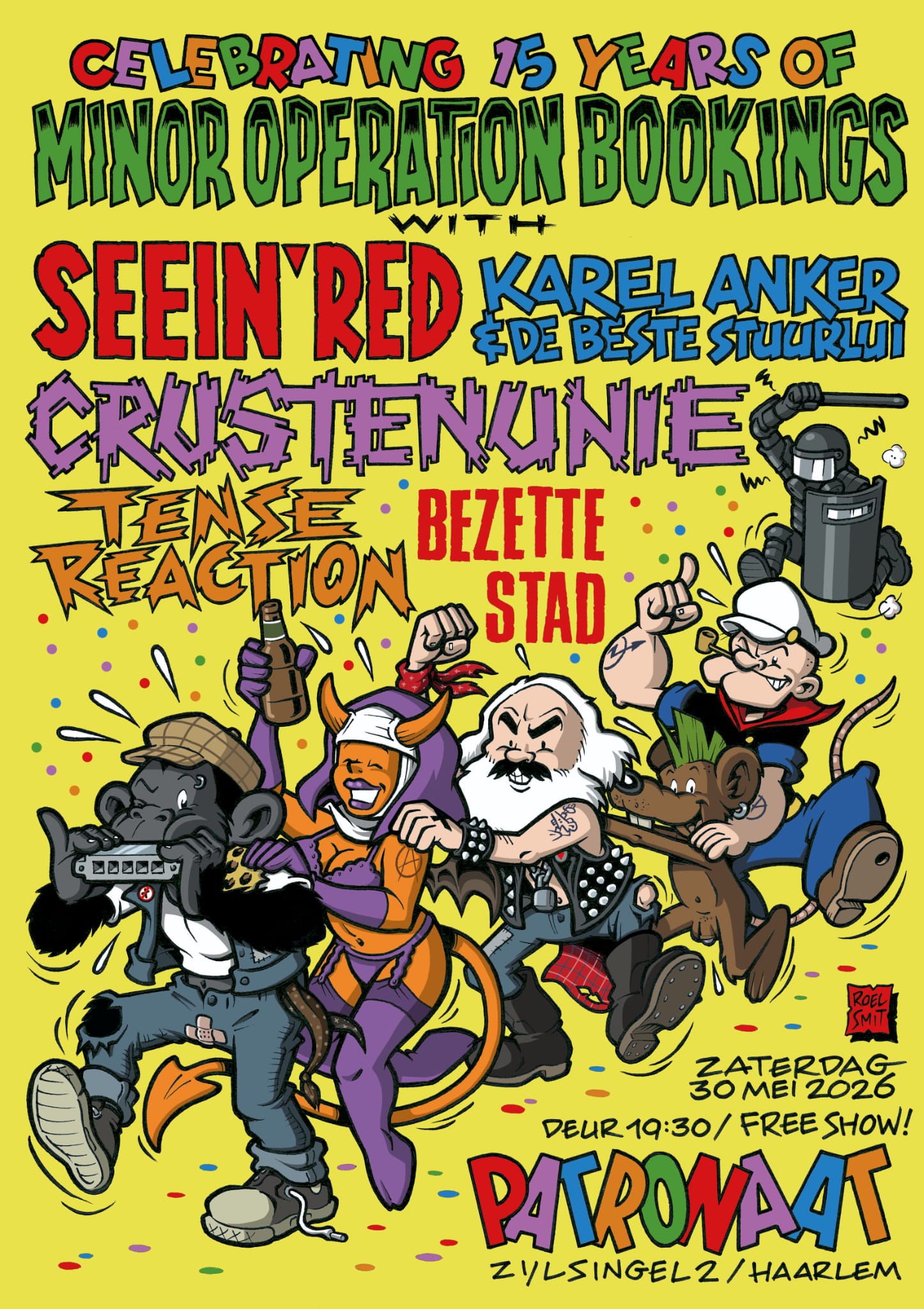 Zaterdag 30 mei 2026 staat Patronaat in het teken van 15 jaar Minor Operation Bookings, en dat vieren we met een keiharde hardcore punkpackage en een selectie van beste vrienden van het Haarlems DIY collectief: Seein’ Red, Karel Anker & De Beste Stuurlui, Crustenunie, Tenue Reaction en Bezette Stad.