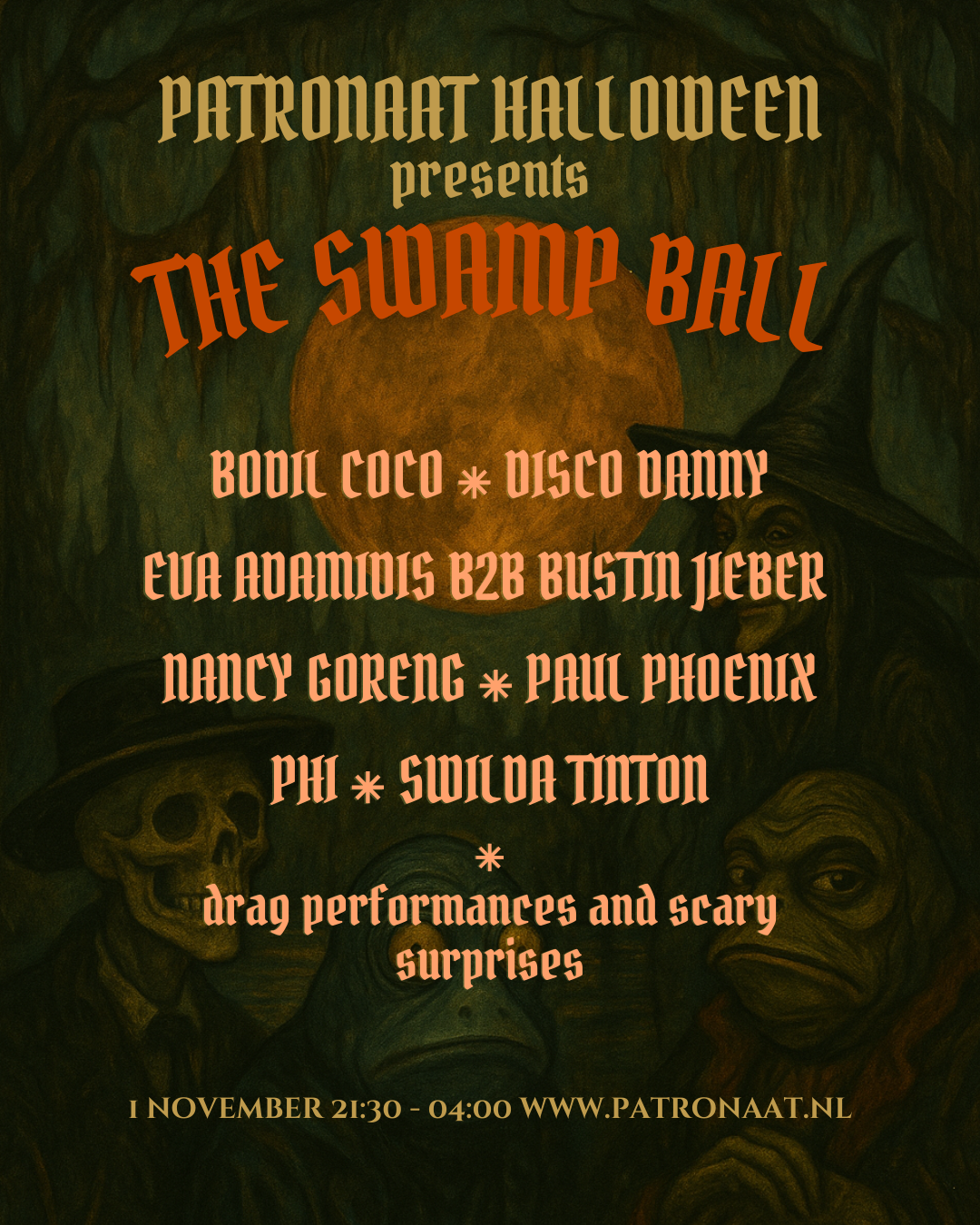 Op zaterdag 1 november opent Patronaat de poorten naar een vervloekt moeras vol duisternis, magie en verleiding. Hét grootste Halloween-event van Haarlem trekt je mee in een nacht waar geesten fluisteren, schaduwen dansen en geen ziel ongeschonden terugkomt.